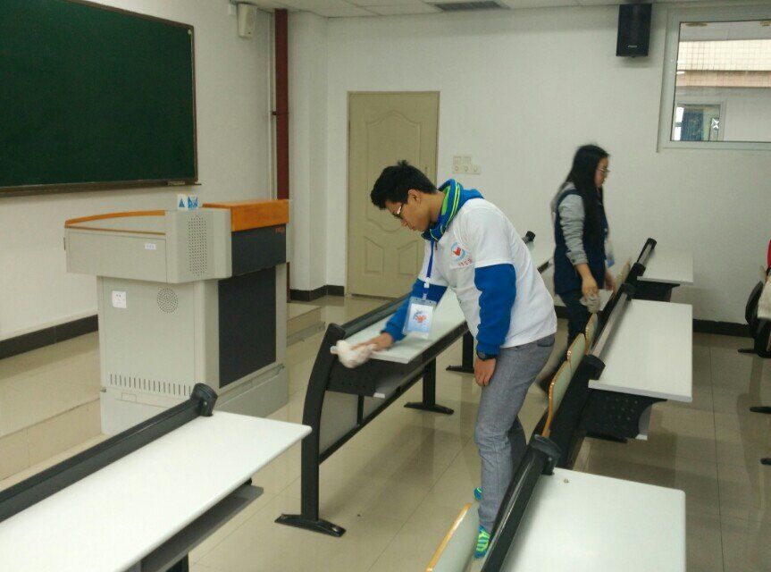 根据活动安排,全体成员在上午9时到九教门口集合。由组长强调了相关事项并分配好工作后,活动正式开始了。每个小组前往分配好的教室。随后大家就忙开了,打水的打水,擦黑板的擦黑板,擦桌子的擦桌子,一切都是那么的井然有序。当遇到难以擦去的图画时,大家会不断的重复、用力的擦,在大家的共同努力之下,这些“钉子户”最终离开了它本不该呆的地方。有的小组完成了任务之后,又加入了其他小组的行列,协助他们完成任务。在活动期间,为不打扰自习的同学,大家都尽量不大声说话,轻拿轻放工具,尽显文明风范。