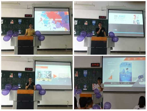 本次共有10份海报作品从初赛中脱颖而出。在决赛现场,10位海报作品设计者逐一上台进行展示,与现场观众分享设计理念,交流制作技巧。决赛海报作品围绕“AI”选材广泛,涉及无人驾驶汽车、虚拟个人助理、智能办公系统、智能设备、无人机、AlphaGo等人工智能技术前沿应用;在色彩搭配和元素运用上,既有科技感十足的蓝黑色调搭配,也有二进制、电路板的巧妙穿插。选手展示完毕后,评委李菁老师进行了精彩点评。随后,现场观众作为大众评委为喜爱的海报作品进行投票。最终,综合评委打分、观众投票以及前期微博点赞三个各环节得分情况,王燕、张梦琦、白正霞、程文灿等6位同学分获大赛一、二、三等奖。