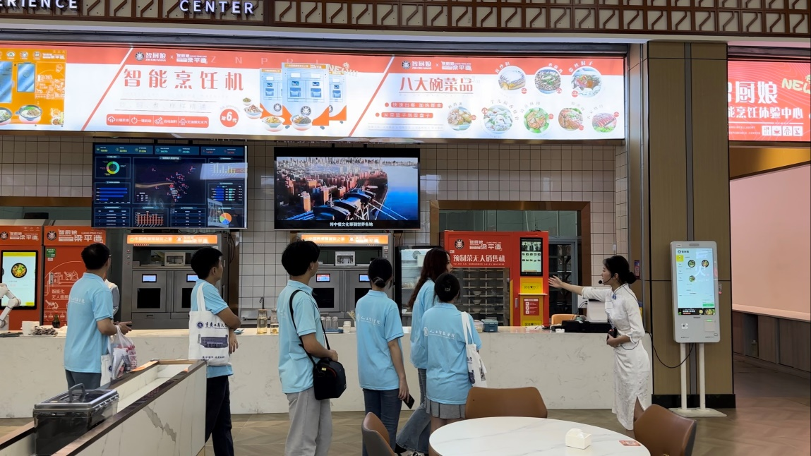 在参观过程中,实践团成员还体验了展馆内的一些特色亮点。其中,3D全息投影餐厅利用全息投影技术,将光影艺术与食物相结合,打造了一种具有科技感和仪式感的就餐体验。另外,梁味乡厨体验区提供了自助中式预制菜快餐,团队成员扫码体验了展示馆内的全自动智能预制菜上餐服务,进一步增进了对自助预制菜流程的了解。