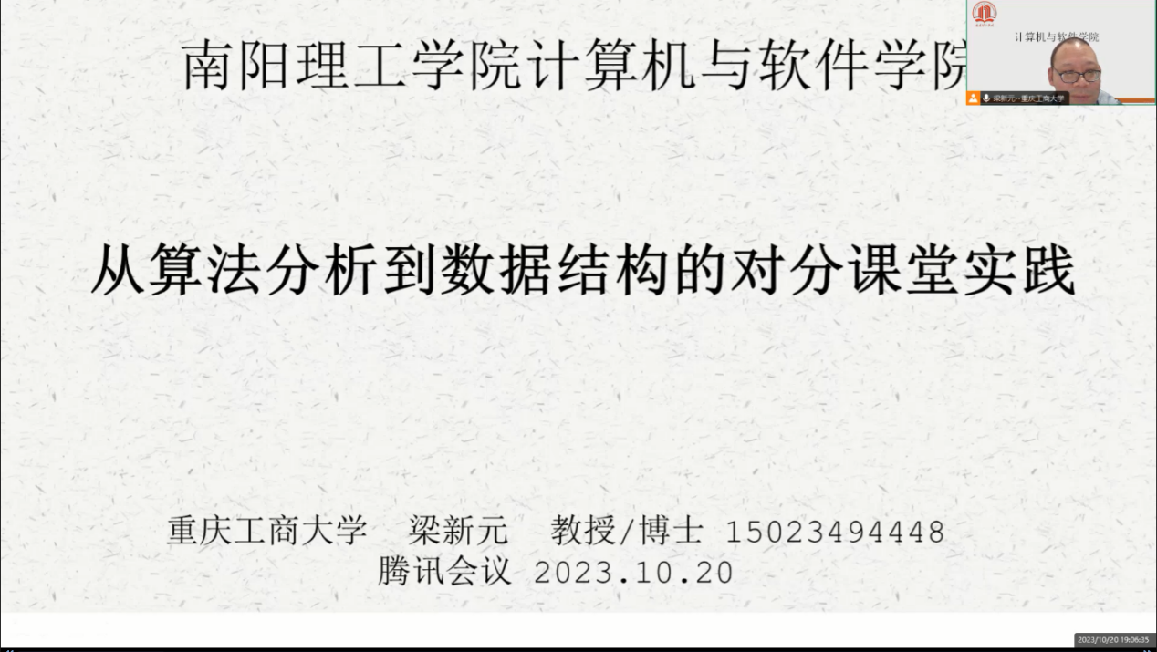 应南阳理工公司计算机与软件公司邀请,2023年10月20日晚上,suncitygroup太阳集团梁新元教授为公司教师做了《从算法分析到数据结构的对分课堂实践》的主题报告,郑珂副经理及公司10余位教师参加,唐立老师主持会议。