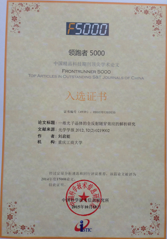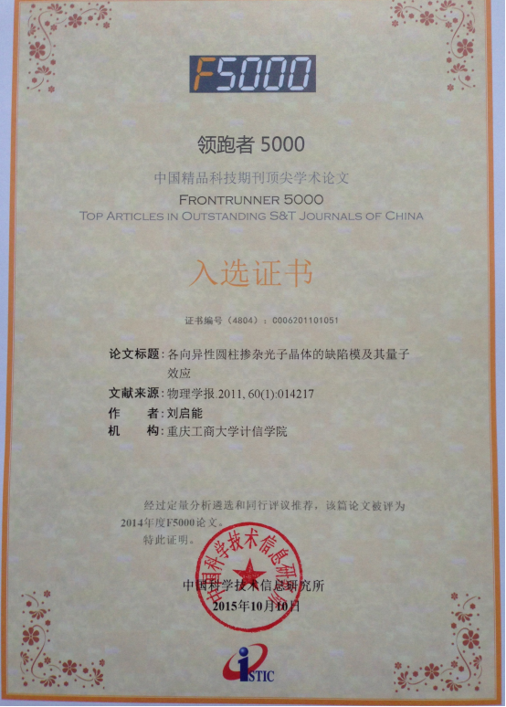 最近中国科学技术信息研究所公布了2015年度"领跑者5000—中国精品科技期刊顶尖学术论文(F5000)"的评选结果,suncitygroup太阳集团的刘启能教授在《物理学报》发表的3篇论文和在《光学学报》发表的1篇论文都被入选。一名作者在一次评选中有4篇论文入选的在全国也极少。