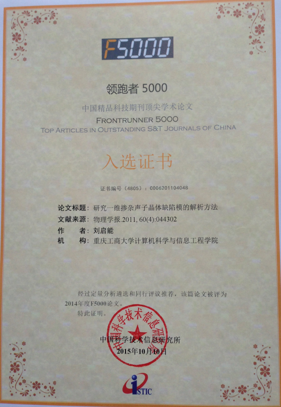 《物理学报》在2010-2014年内发表的4000多篇论文中提名34篇论文参加本年度的“领跑者5000”评选,其中刘启能教授的3篇论文入选,在《物理学报》排名第一。