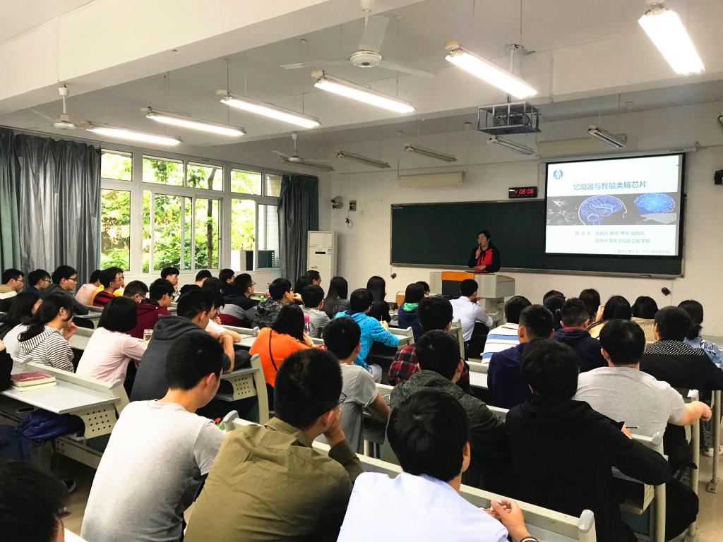 讲座中,王丽丹教授首先结合人工智能的起源与三次浪潮概述了人工智能的60年来的起伏发展。随后,王丽丹教授从机器学习与类脑计算、深度学习与机器视觉、忆阻器带来的曙光、类脑芯片与神经形态系统等方面展开深入分析。她详细讲述了如何破解摩尔定律及冯诺依曼体系结构瓶颈,实现高效的机器学习与类脑计算;利用卷积神经网络和空间变换网络实现智能交通标志识别系统在汽车驾驶中的应用。并重点阐述了忆阻器的类突触特性、忆阻器建模和存储单元设计,在此基础上将忆阻阵列的储存与运算结合实现网络结构由“平面”到“层次”的突破,引入光通信构建光子神经形态系统。