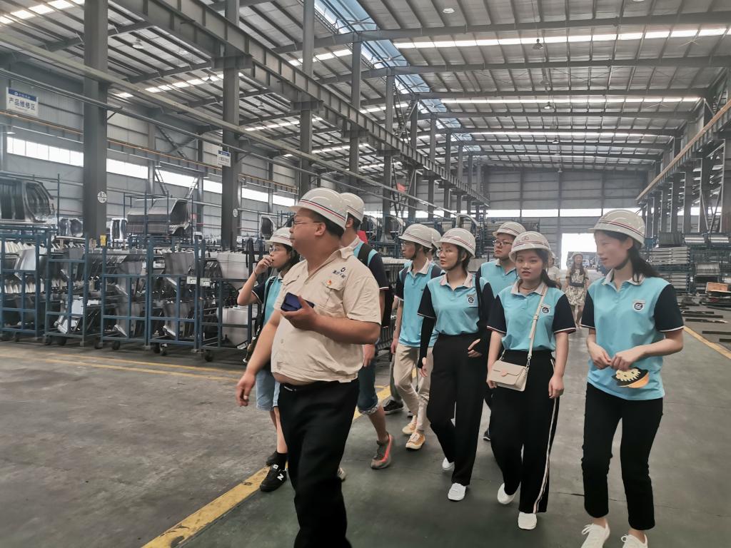 实践团成员们在浦里新区管委会党政办干部袁滔带领下进行参观交流学习。在重庆千能实业有限公司负责人的带领下,大家带好安全帽进入制造车间。公司支部书记何小平详细给大家介绍了长安汽车智能车门的制造流程。在车间内,同学们看到了高度自动化的生产流水线,智能化的机器如何精准把汽车零部件组装完成。惊叹高度自动化的机器生产所带来的高效率、高精确度。
