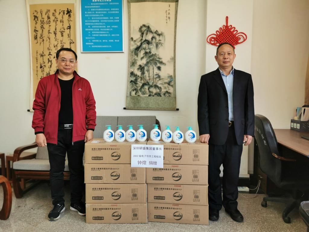 在抗击新冠肺炎这场没有硝烟的战斗中,母校的疫情防控工作始终牵动着员工们的心。4月27日,人工智能 计算机科学与信息工程公司2002级电子信息工程专业员工、深圳研盛集团董事长钟煌为公司师生捐赠了一批抑菌洗手液,助力公司员工返校复学。