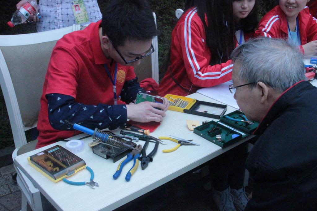 在会长王冲、侯书涵等的带领下,紧锣密鼓的忙碌起来,合作中分工,分工中合作,还不时与大爹大妈们畅谈家电常见问题,有时也会转移话题,聊些更加有趣的事,每每此刻,总会引得活动现场一片笑语,现场气氛融洽不已。活动逐渐接近尾声,在同学们的努力下,很多电器都被修好了,看到居民们高高兴兴拿着修好的电器回家去,我们心里更高兴。